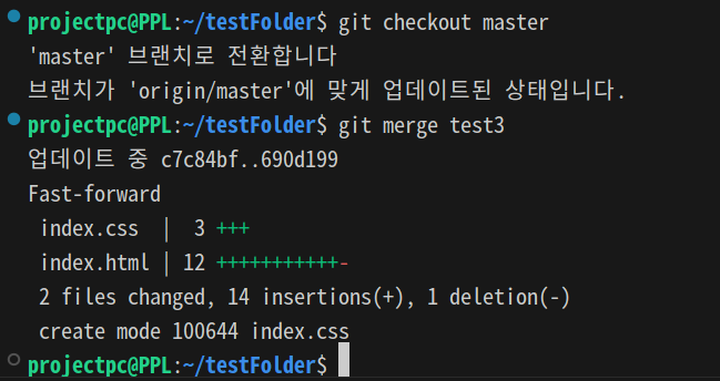 다시 test3 브랜치로 돌아와서( merge 한다고 브랜치는 삭제되지 않는다. )