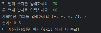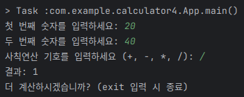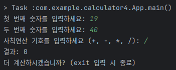 System.out.println("더 계산하시겠습니까? (exit 입력 시 종료)");
